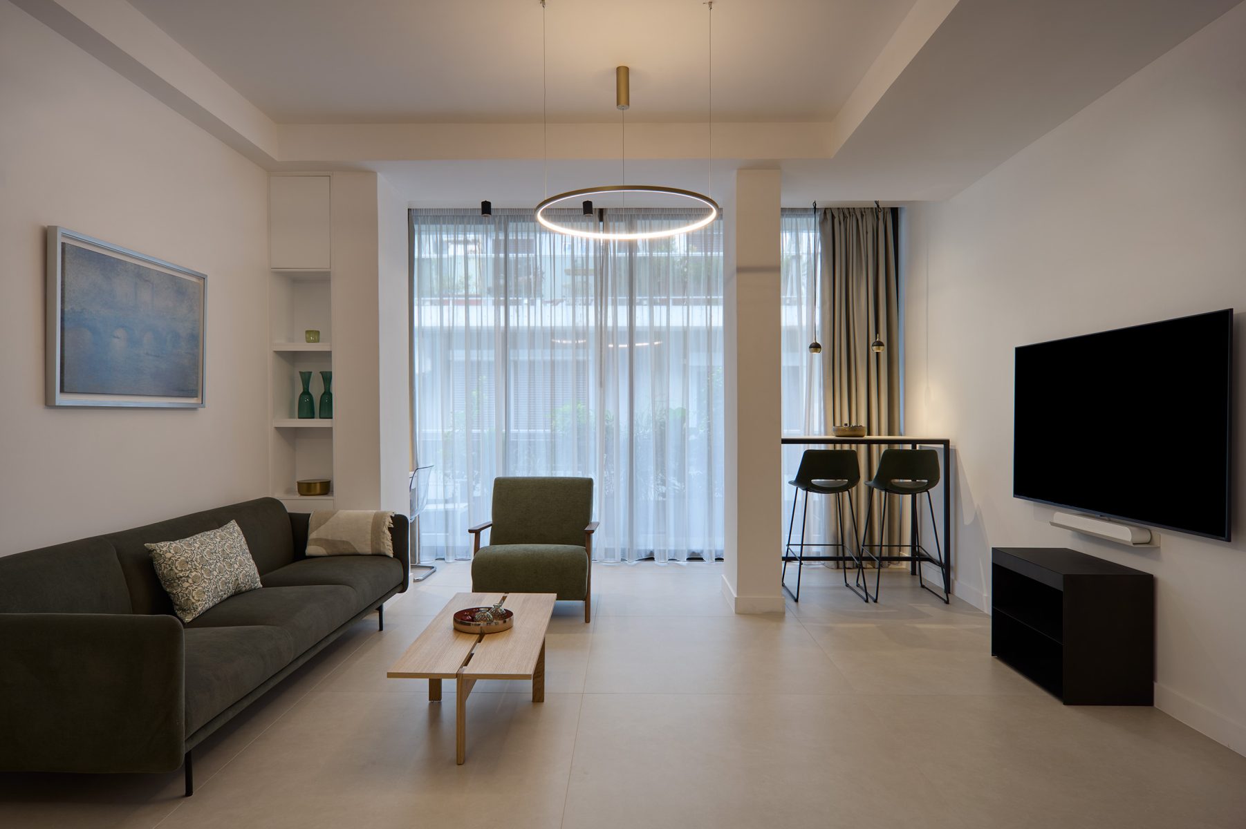 Η ανοιχτή διαρρύθμιση του σαλονιού σας υποδέχεται με ήπιους τόνους, επιλεγμένη διακόσμηση και designer έπιπλα — όλα ανοίγουν σε ιδιωτική βεράντα με πράσινο, προσφέροντας μια σπάνια αίσθηση ηρεμίας στην καρδιά της Αθήνας.