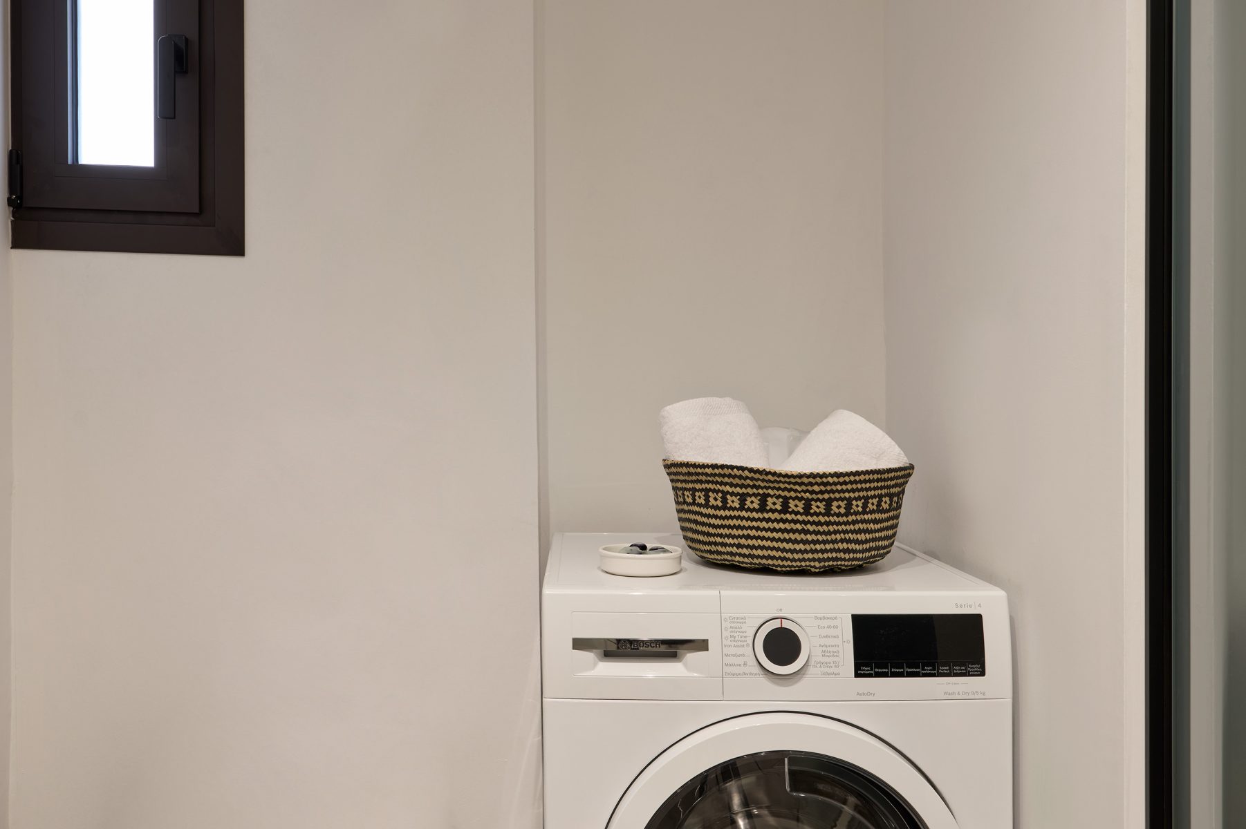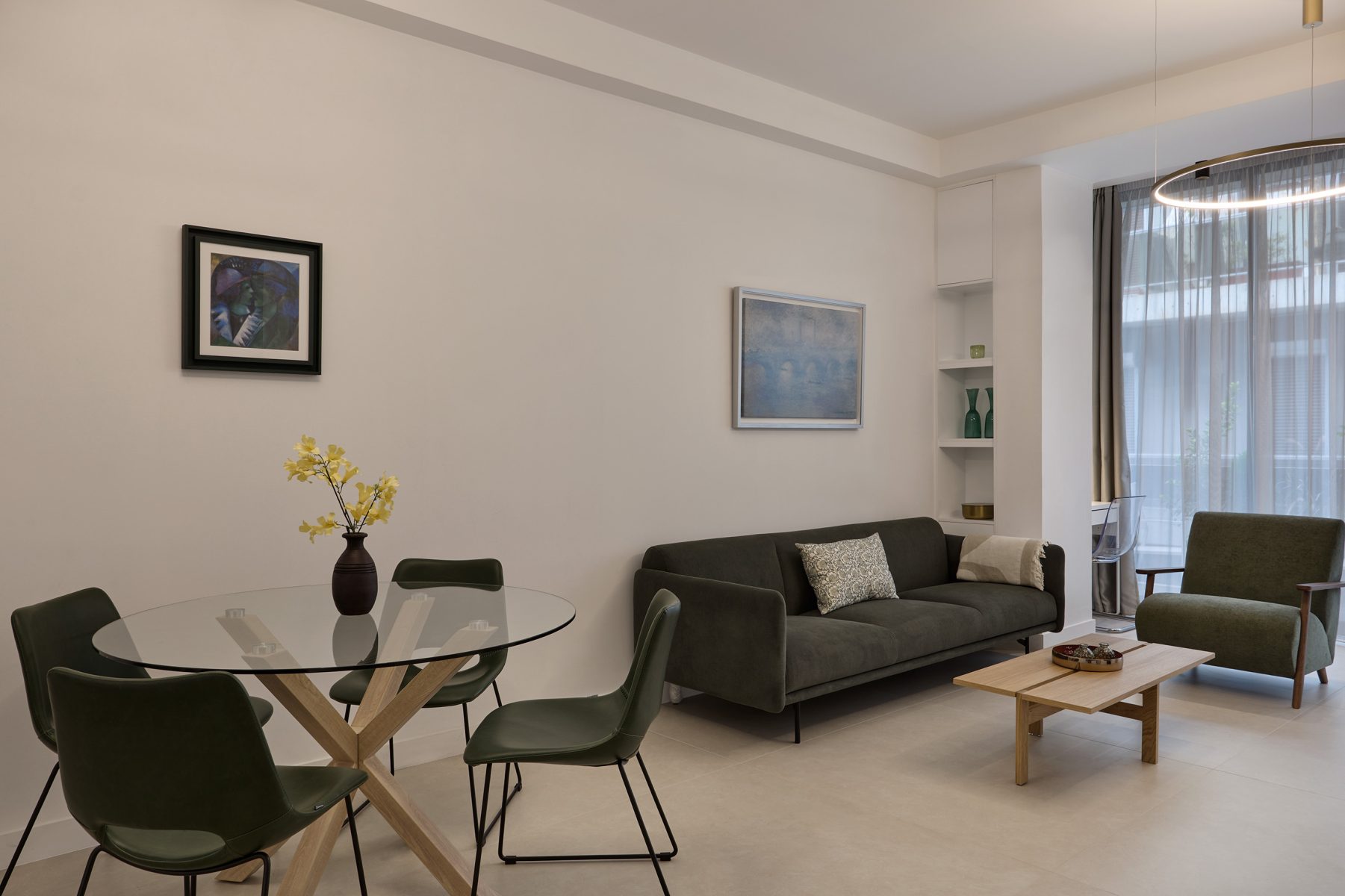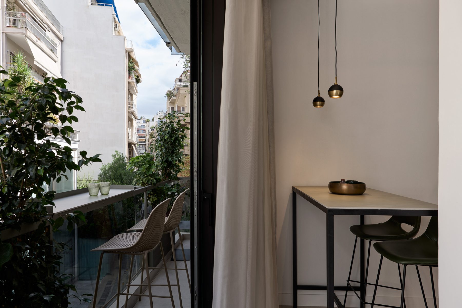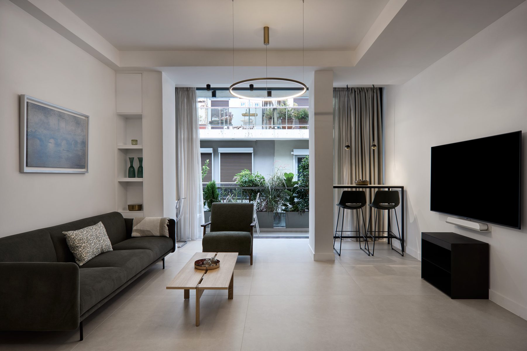 The open plan living area welcomes you with soft tones, curated decor and designer furnishings – all opening onto a private veranda surrounded by greenery, offering a rare sense of calm in the heart of Athens.