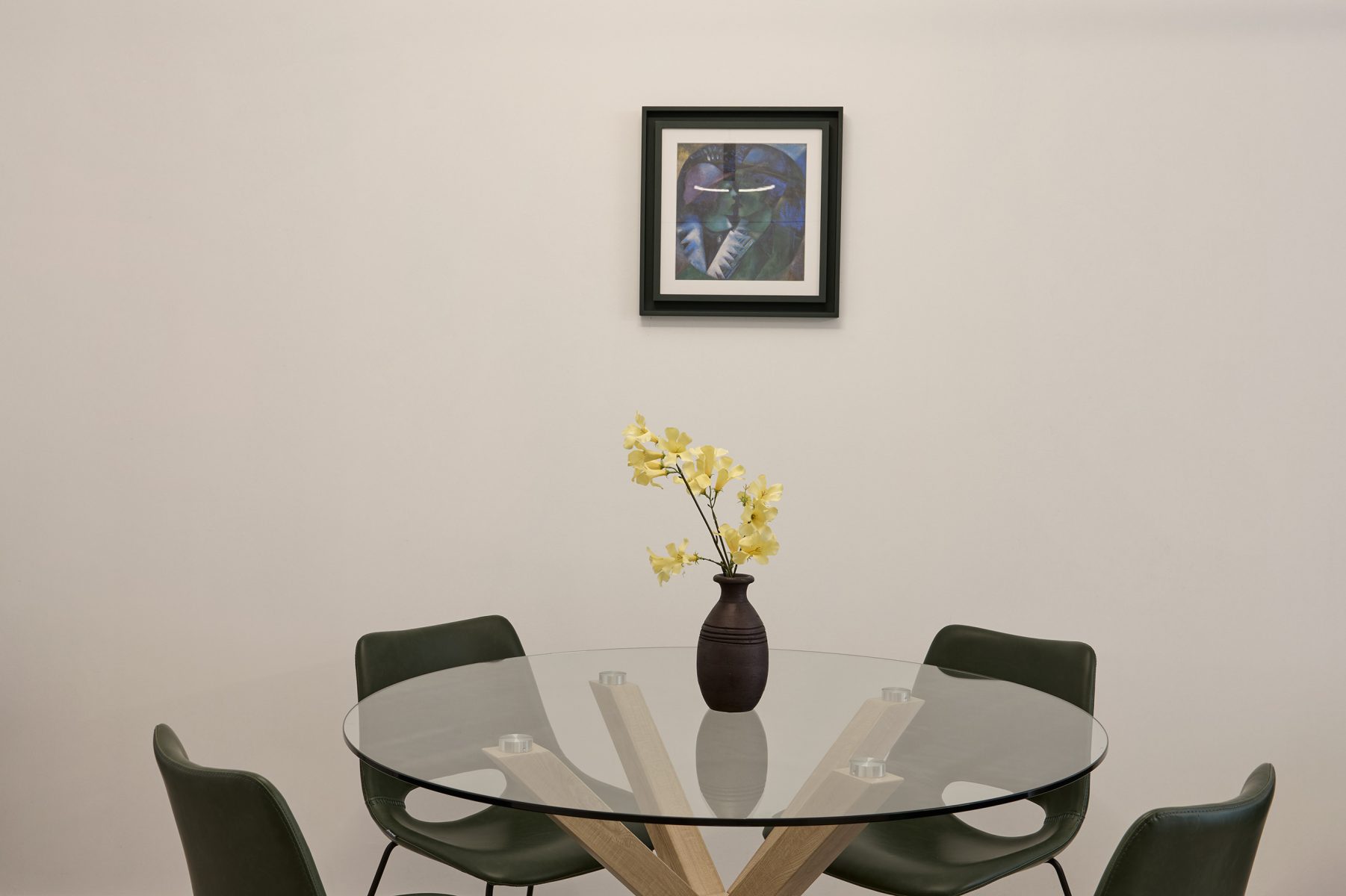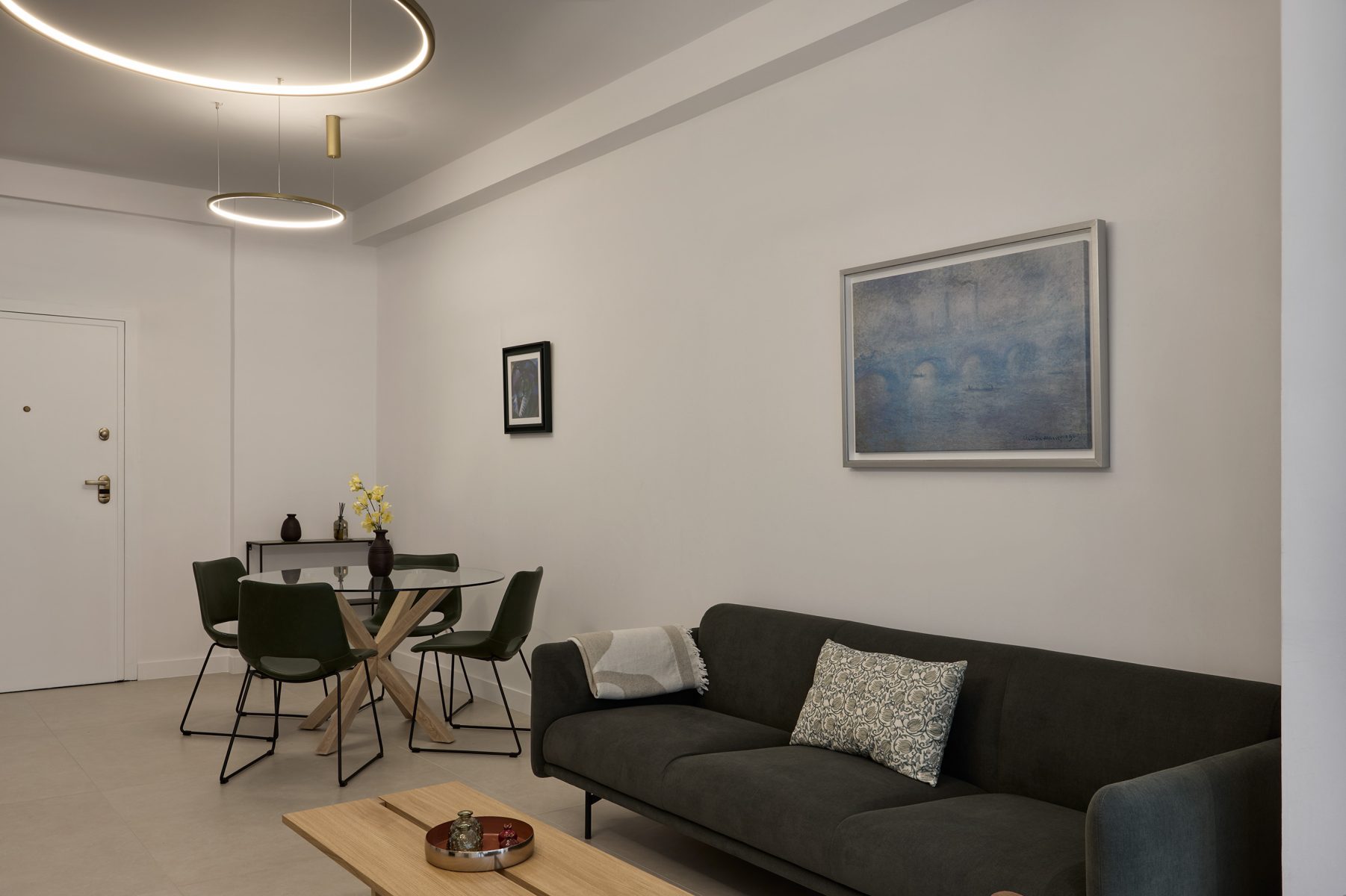 The modern kitchen is fully equipped for everything from a relaxed breakfast to an intimate dinner, while the refined materials, ambient lighting, and thoughtful details reflect the sophisticated spirit of Kolonaki living.